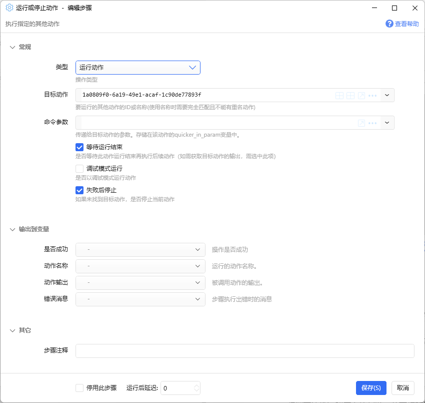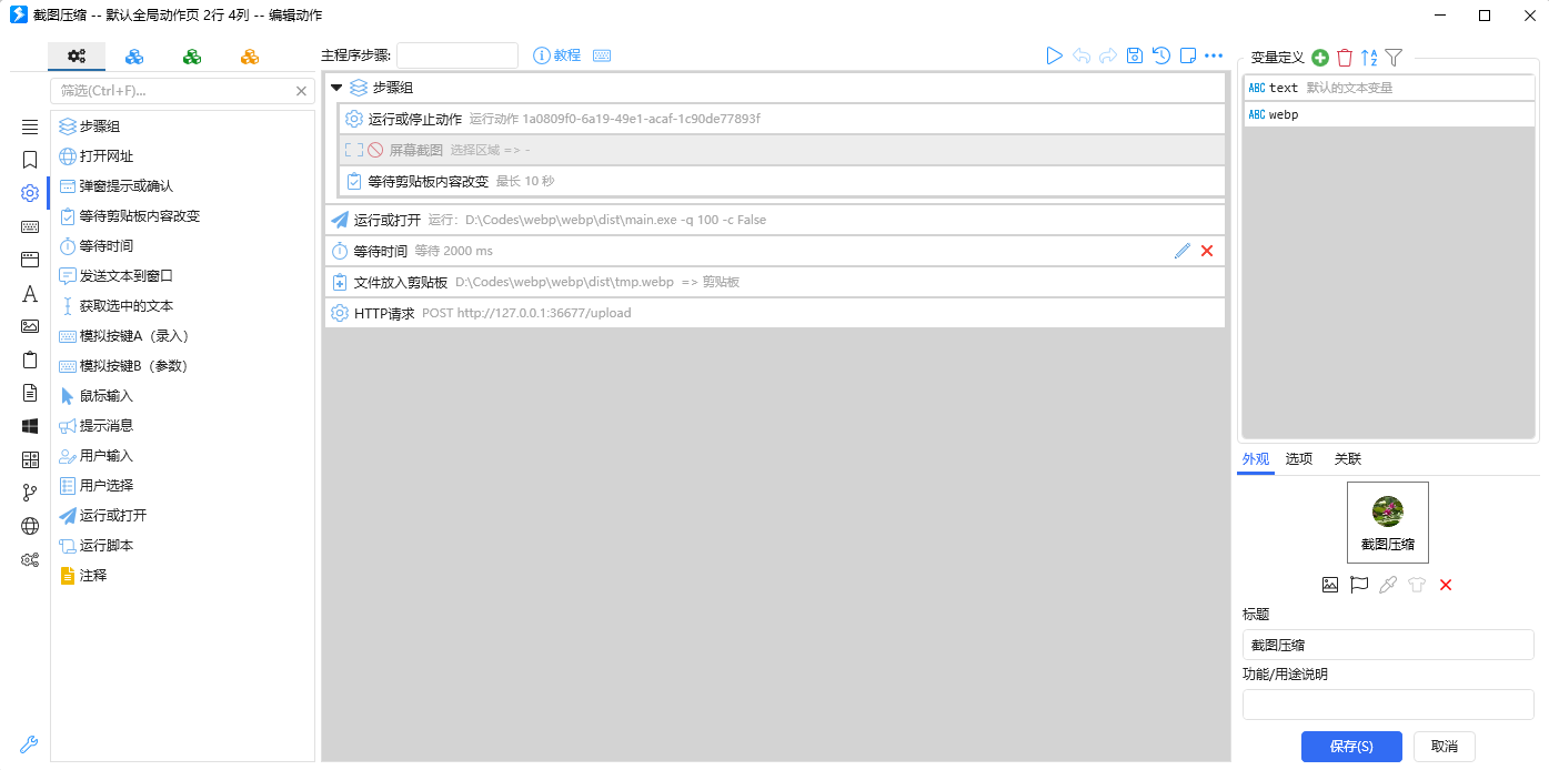 新建动作:大致有几个步骤,运行截图,将截图内容写入粘贴板,调用打包程序转化格式,进一步的读取该转化文件,并通过PicGo-Server上传到对应的图床。