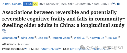 今天给大家分享一篇在 2025年4月发表在《BMC Geriatr》(2区,IF=3.4)的文章。本研究旨在探讨 RCF 和 PRCF 对中国社区老年人跌倒的影响,并确定 CF 是否比单独的认知障碍或虚弱带来更高的风险。