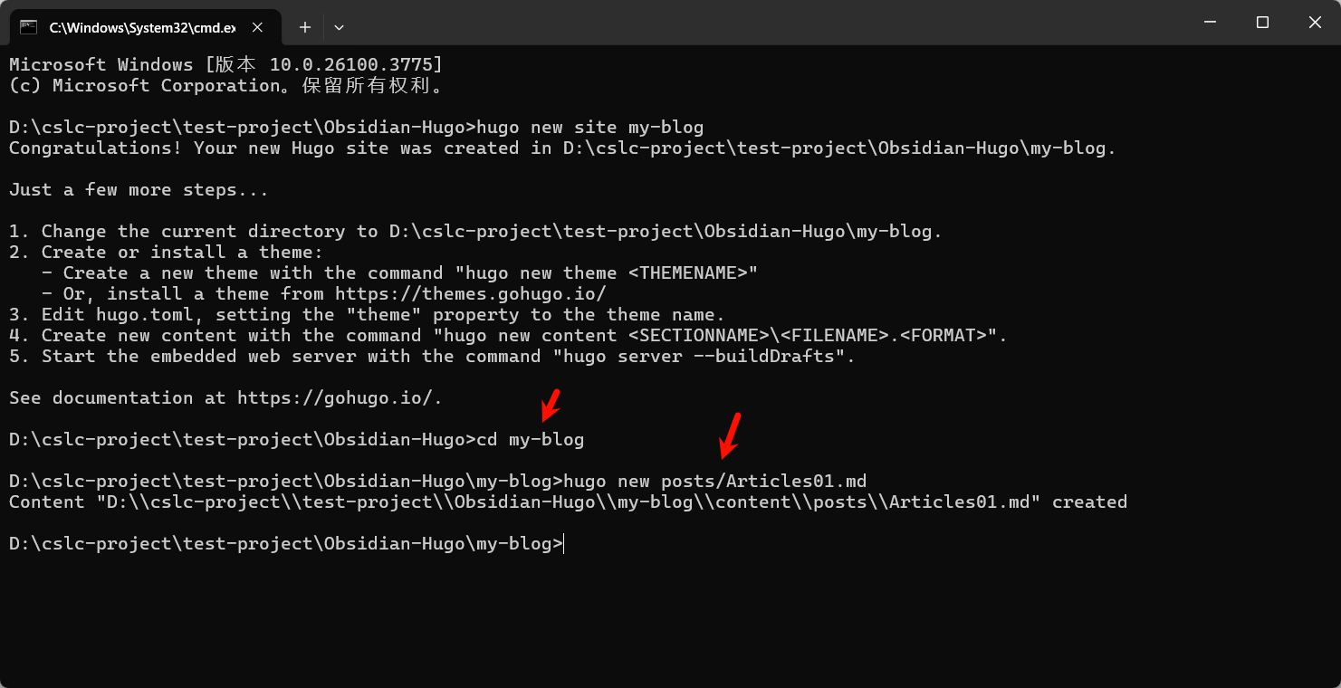 首先,我们进入到要创建博客的文件夹内,执行 hugo new site 博客名 ,就可以创建博客了。注意,我们为什么要进入这个文件夹呢?因为博客会创建在我们执行这个命令时的目录中的,因为我想把博客放在 Obsidian-Hogo 文件夹内,所以我要 cd 进去。