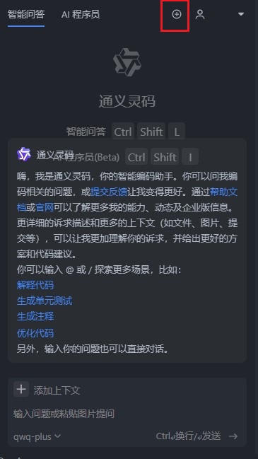 **创建新会话:**在智能问答的右上角有一个圆形 + 号按钮,点击即可创建新对话。