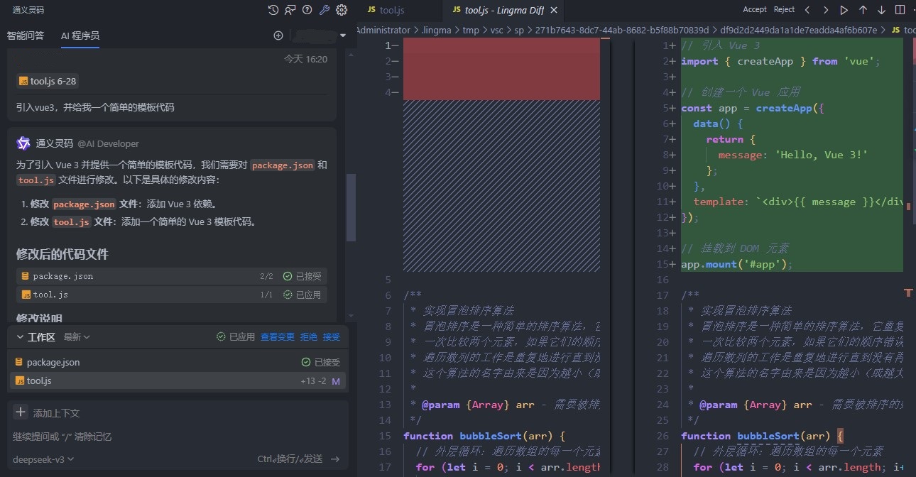 智能问答往往基于单个文件或者部分代码片段,而通义灵码提供了AI程序员的功能,它基于整个项目,有些时候实现某个功能需要多个代码文件一起修改,AI程序员就能轻松胜任!