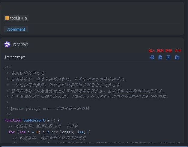 通义灵码生成的代码一般都会在右上角有这四个小按钮,分别对应着插入、复制、新建和合并的功能,后续的功能会用到这些小技巧。