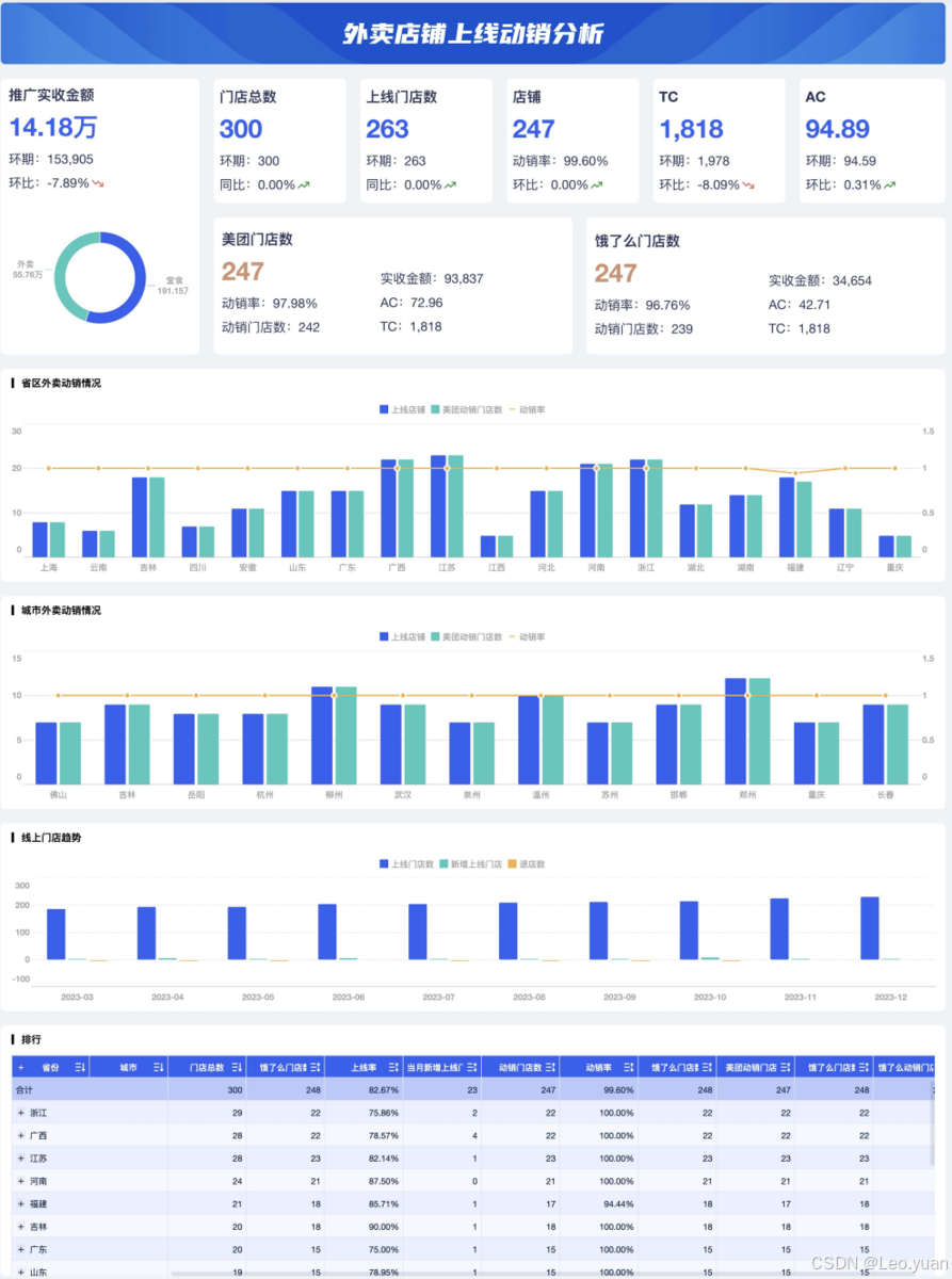 市场趋势预测:通过对市场数据、竞争对手数据等进行分析,企业可以预测市场趋势,提前做好市场布局。例如,分析行业的增长率、市场份额的变化等,为企业的战略决策提供依据。下面是我用FineBI制作的外卖店铺线上动销分析看板,可以对关键指标进行快速整理和分析,通过拖拉拽,就可以搭建可视化仪表盘。本文举例所用的图都是我用FineBI来搭建的。这套看板的相关模板我已经整理好了,有需要的可以点击卡片领取,修改参数就能直接套用。