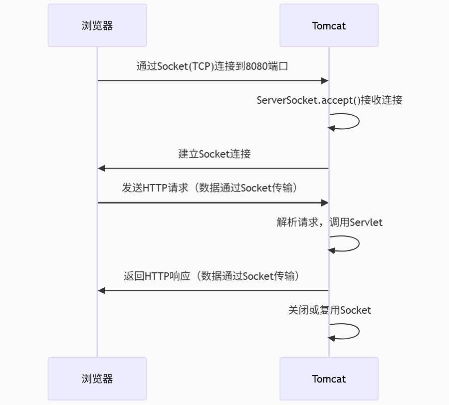 当用户访问网站时,浏览器通过Socket(TCP连接)向Tomcat发送HTTP请求。