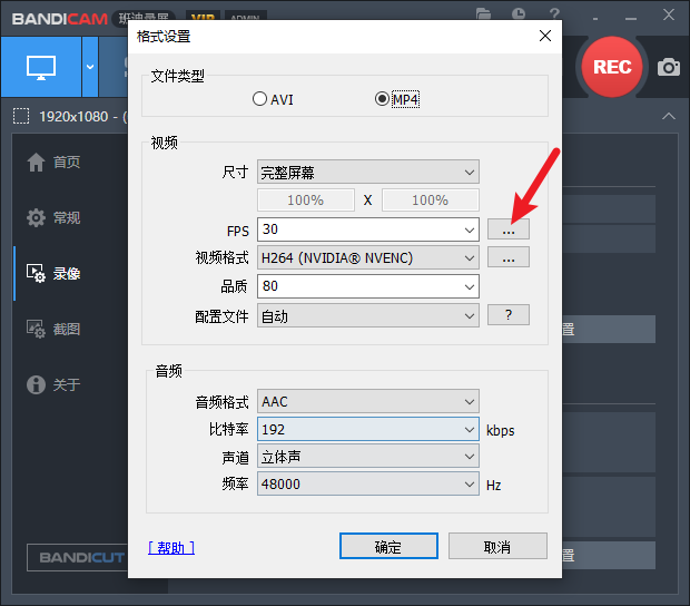Bandicam FPS 帧率模式 VFR(可变帧率) 和 CFR (恒定帧率),设置在 [录像] => [格式] => [设置] => [...]。如下图所示: