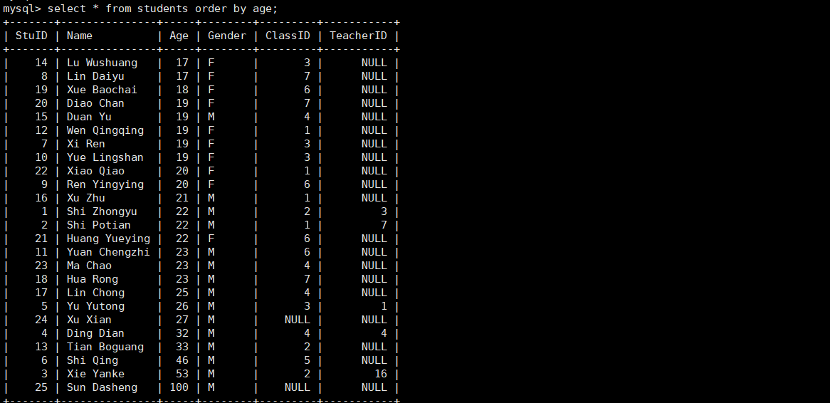 select * from students where classid=1 order by age; #找出1班的人按升序排序