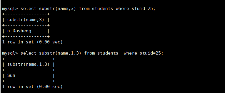 select right(name,3) from students where stuid=1; #显示name字段 右边三个字符 即最后三个