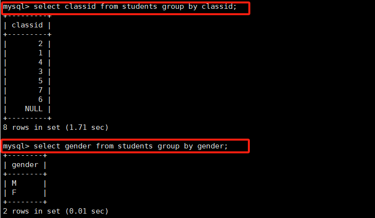 select classid,count(*) from students group by classid; #按classid分组,并显示每一组的人数