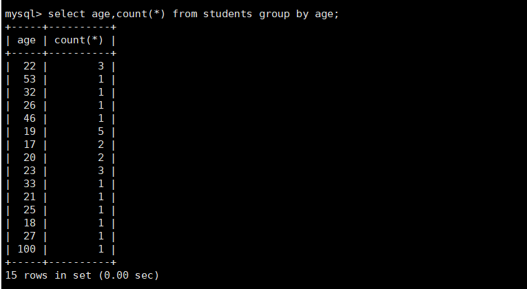 select age,count(*) from students group by age; #按年龄分组,并显示每一组的人数
