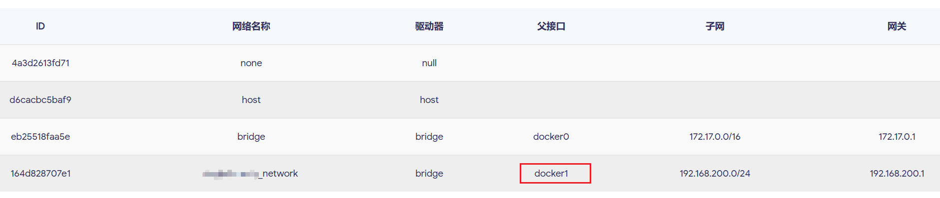 在配置完docker1网络后,可以在dockerman中看到父接口: