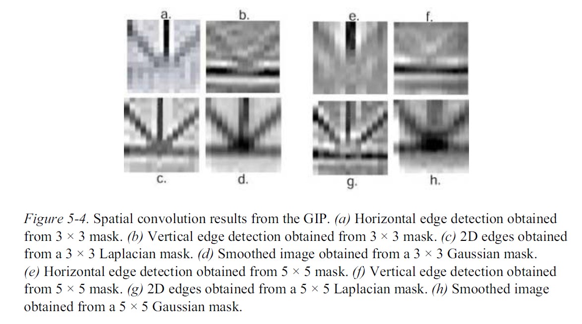 GIP 使用本章后文将讨论的编程位模式进行了测试。图 5-4 展示了入射图像与图 5-5 中的卷积核进行卷积时,芯片的输出示例。图像(a)至(d)使用 3×3 卷积核计算,而图像(e)至(h)使用 5×5 卷积核计算。5×5 核与 3×3 核结构相同,区别在于用 2×2 子区域替换了核中心轴以外的像素(见图 5-5)。构建更大尺寸的核时采用了类似技术。