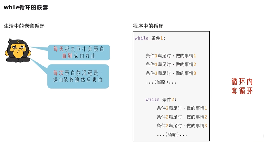 - 41 节嵌套循环:直接用来算「如果每天背 5 个单词,坚持 30 天能背多少」(外层 30 天,内层每天 5 个,打印总数);