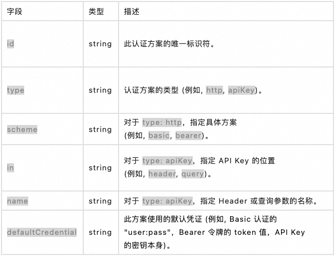 requestTemplate.security.id:引用在 ``server.securitySchemes中定义的方案的id。requestTemplate.security.credential:(可选) 允许您为此特定工具的后端调用覆盖方案中的 ``defaultCredential。