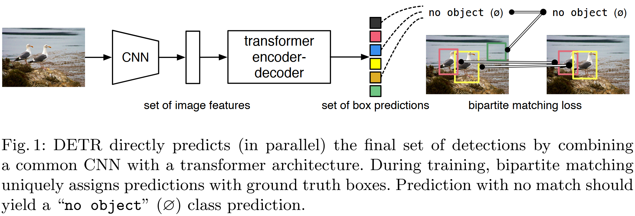 简单来说,DETR 首先通过一个卷积神经网络 (CNN) 提取图像特征,然后将这些特征以及一组可学习的“对象查询” (object queries,数量为 N N N) 输入到一个 Transformer 编码器 - 解码器结构中。解码器的输出即为 N N N 个预测结果,然后通过二分图匹配与真实标签进行匹配,并计算损失进行端到端训练。