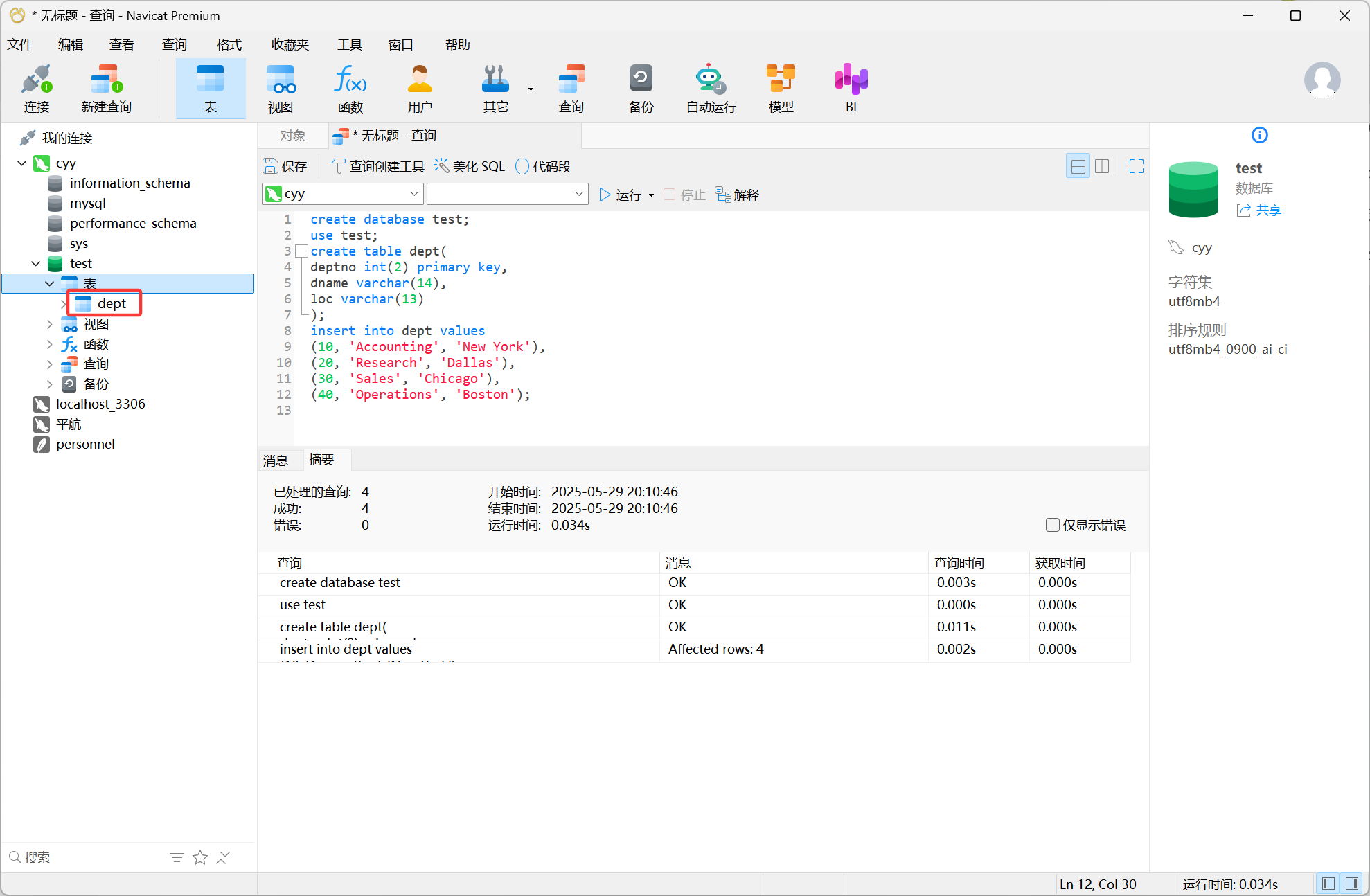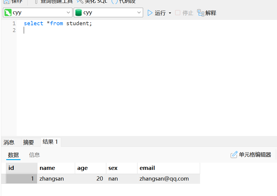 先创建一个新的数据库cyy,并在数据库中创建一张名为student的表