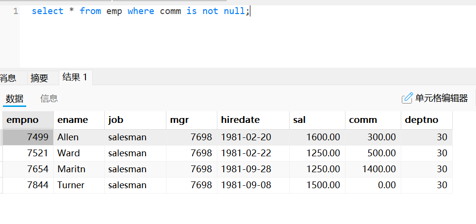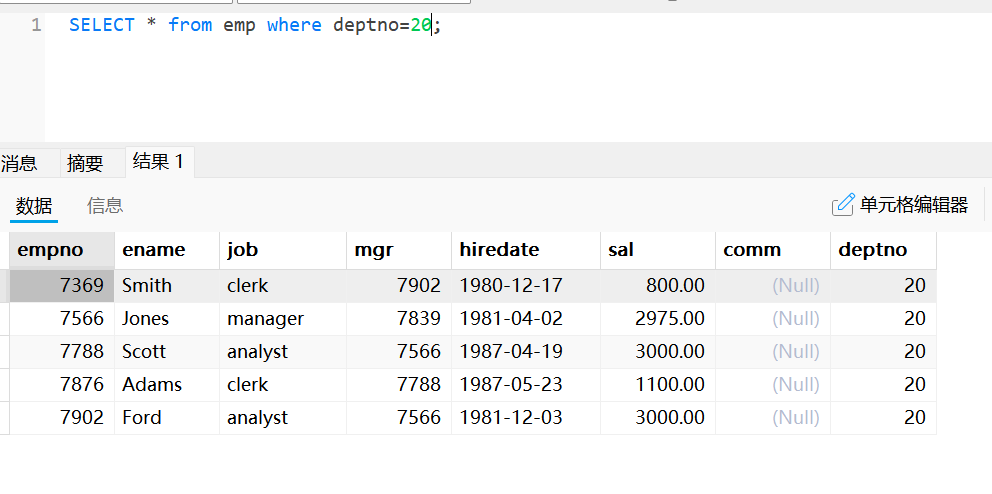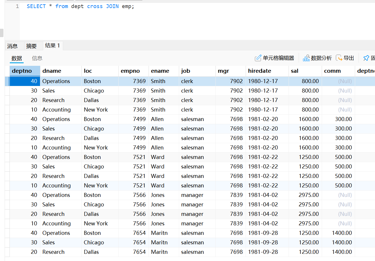 ON e.deptno = d.deptno: 连接条件,表示只有当emp表的deptno列的值与dept表的deptno列的值相等时,才将两表的行组合起来,意味着只会显示那些有匹配部门的员工信息