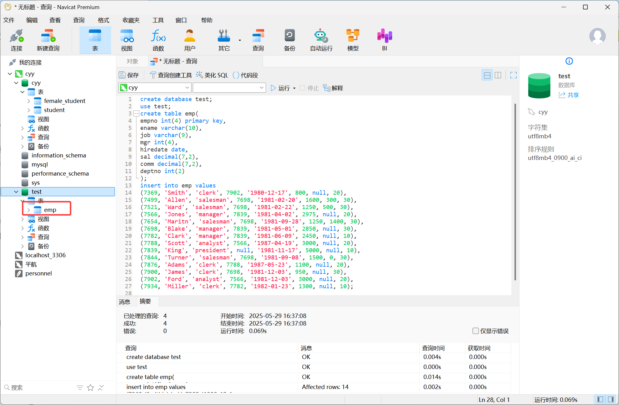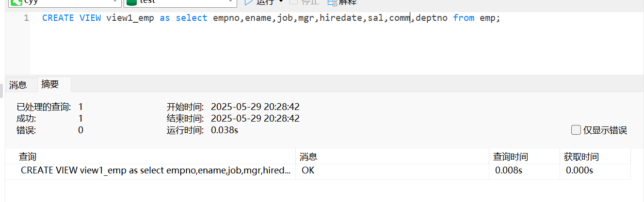 在表单上创建view1_emp视图,在mysql中查询视图可以用下面这个语句