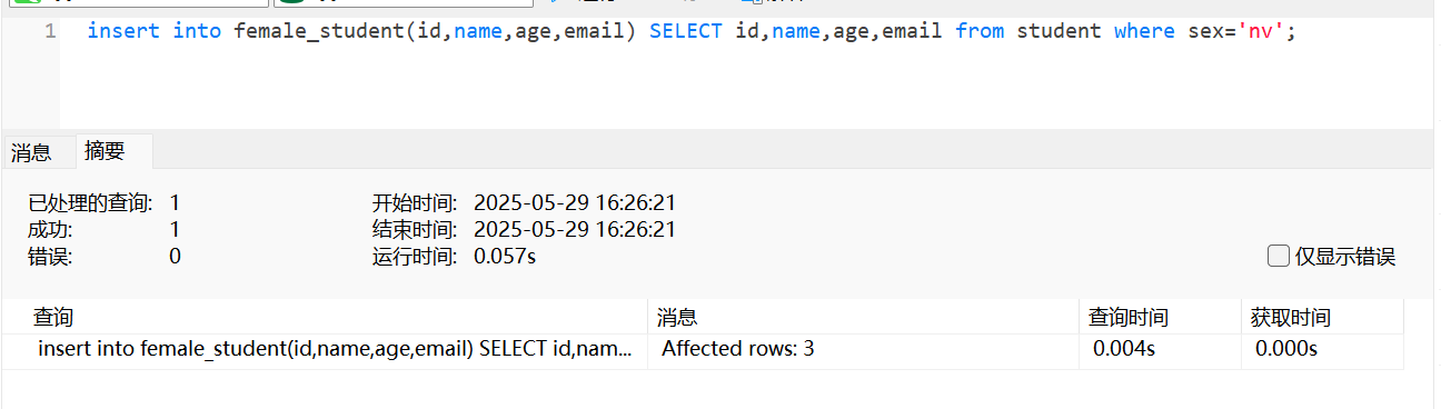 现在有这样一个需求,将student表中性别为女的学生信息提取出来存储到另外一张名为female_student的表中