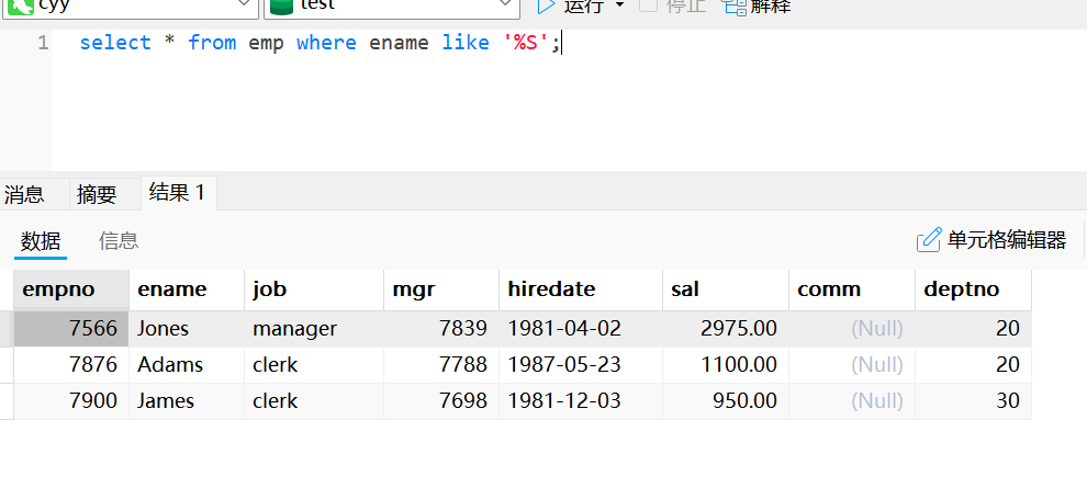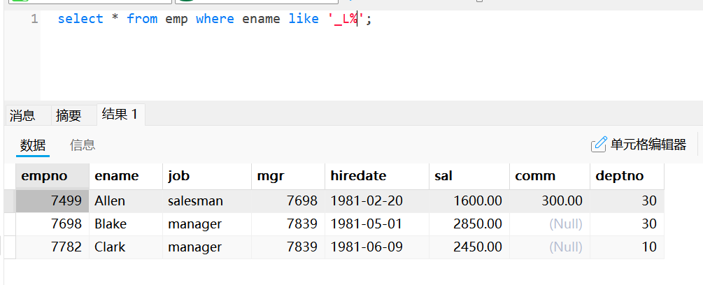 使用“_”通配符和like的模糊查询:ename的第二个字符是“L”