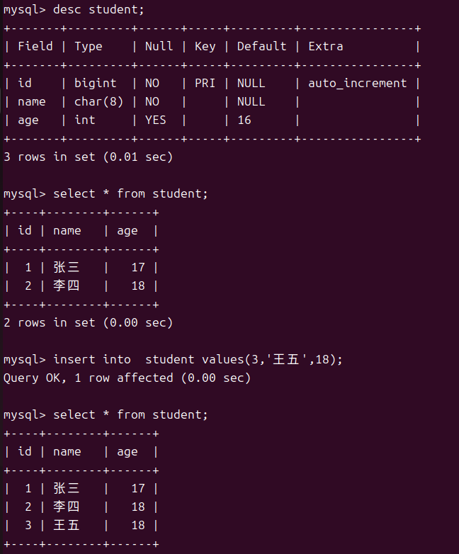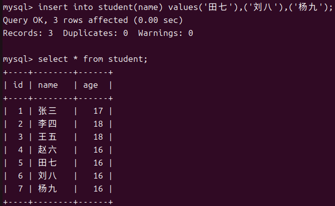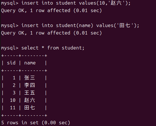 对于使用insert插入行我们可以完成单行数据全列插入,单行数据指定列插入以及多行数据指定列插入。