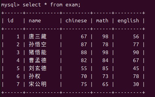 mysql> update exam set english = 60,math = 70 where name = '曹孟德';