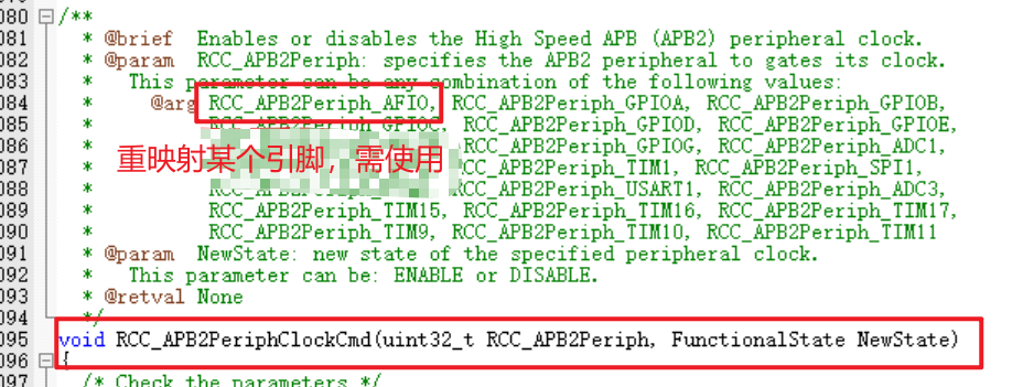 REMAP=0是默认,REMAP=1是重映射到对应的引脚。一旦要有重映射我们就要在代码中配置一个复用时钟函数,如下图: