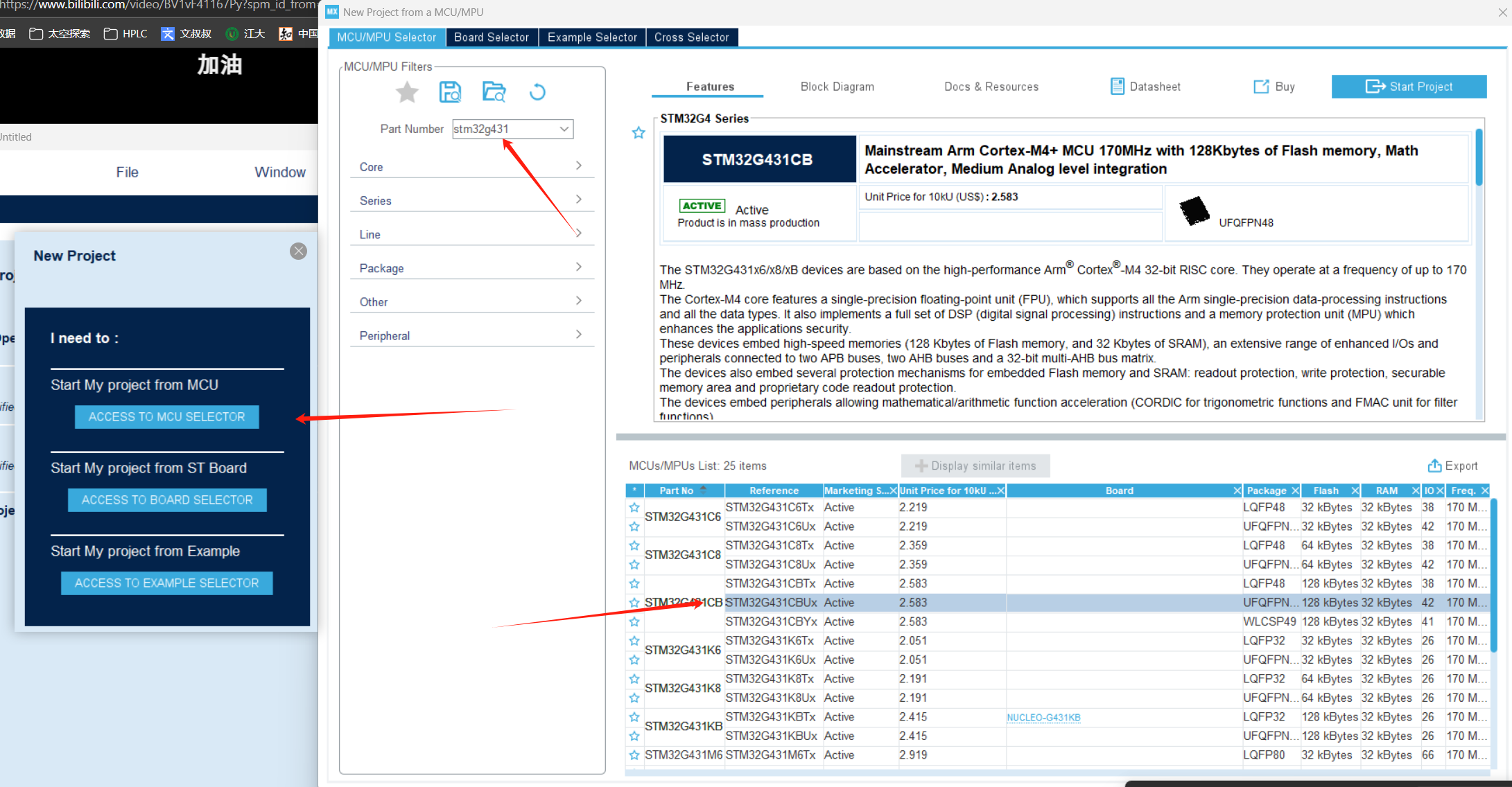 - 打开STM32CUBEMX选择MCU(中间更新太慢可以不更新)