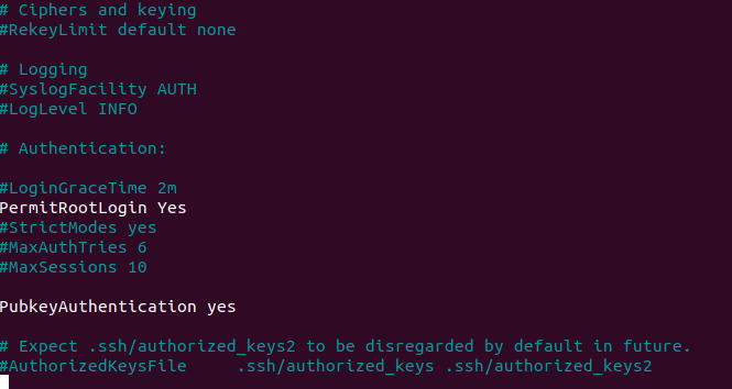 修改以下两行内容,其中PermitRootLogin Yes允许密码登录和在root账号登录,PubkeyAuthentication yes` 允许使用基于公钥的身份验证方法来进行SSH登录,方便后续配置公钥后,免密登录: