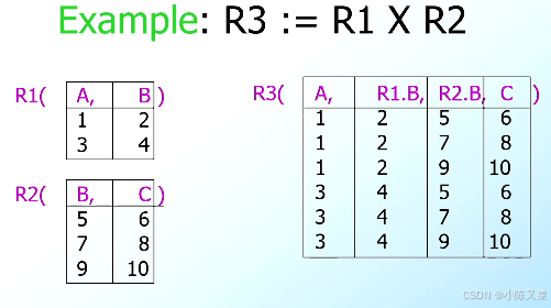 But beware attribute A of the same name in R1 and R2: use R1.A and R2.A.(如果R1、R2中有相同的属性使用R1.A和R2.A来进行区分)