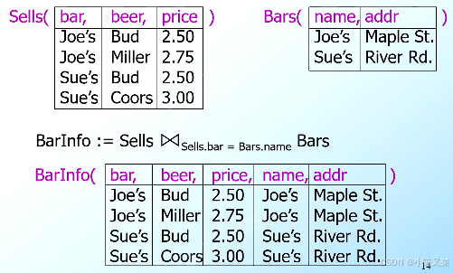 - The natural join of Sells and S consists of quadruples (bar, beer, beer1, price)