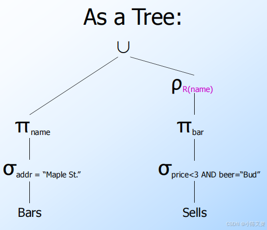 Leaves are operands --- either variables standing for relations or particular constant relations.(叶子结点是操作数,可以是标识关系的变量也可以是常量)