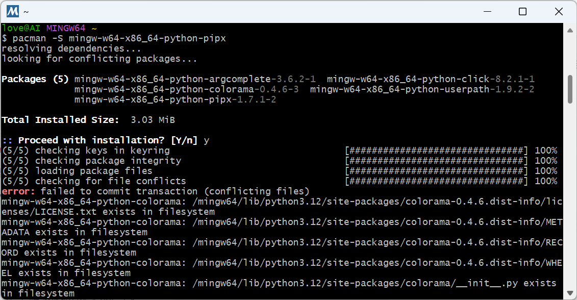 1. 尝试安装 mingw-w64-x86_64-python-pipx —— ❌ 失败