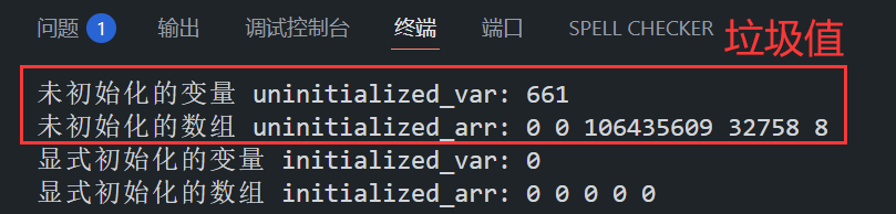 未初始化的风险:局部变量和数组若未显式初始化,其值为未定义的垃圾值(系统之前分配的内存残留值),可能导致程序行为异常。