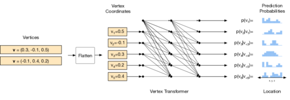 顶点模型采用自回归的方式生成顶点序列。在生成过程中,模型在每一步都会根据之前已生成的坐标来预测下一步的坐标。