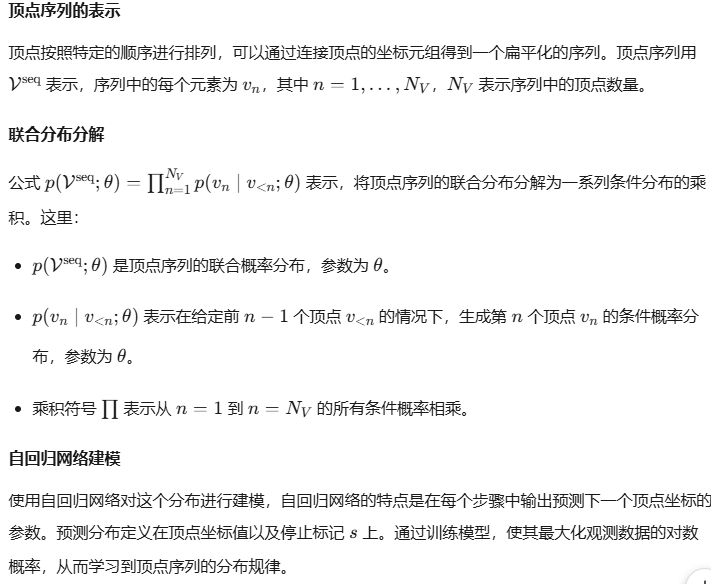公式 (2) :利用链式法则(乘法公式),将联合概率分布分解为条件概率分布与边缘概率分布的乘积。即 p(M)=p(V,F)=p(F∣V)p(V) ,其中 p(F∣V) 表示在给定顶点 V 的情况下,生成面 F 的条件概率分布;p(V) 表示生成顶点 V 的边缘概率分布。这样分解的目的是将复杂的联合分布建模任务拆分为两个相对简单且可处理的部分,先生成顶点,再基于顶点生成面。