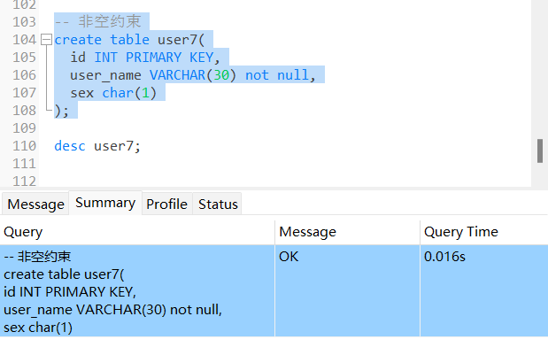 -- 非空约束 create table user7( id INT PRIMARY KEY, user_name VARCHAR(30) not null, sex char(1) );