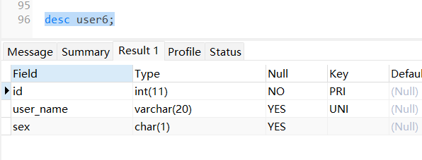 CREATE table user6( id int PRIMARY KEY AUTO_INCREMENT, user_name VARCHAR(20) UNIQUE, sex char(1) );