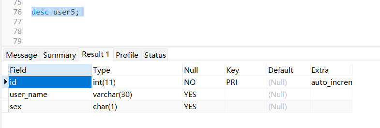-- 创建主键自增的表 CREATE TABLE user5( id INT PRIMARY KEY AUTO_INCREMENT, user_name VARCHAR(30), sex char(1) );