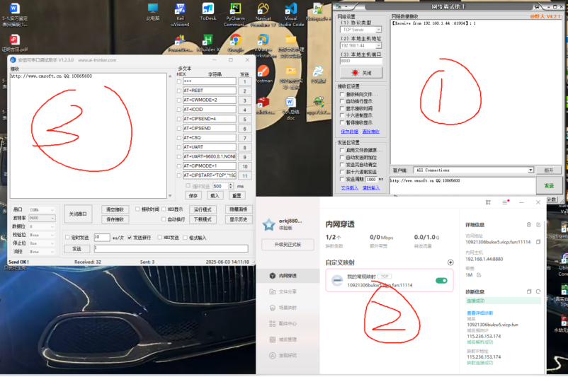 代码解释,我们通过内网穿透的IP,让我们的4G模块连接到这个内网服务器(这个服务器就是被穿透的,他的IP被穿透了,这样我们的4G作为外网通过穿透的IP地址和端口号才能连接上我们的内网),这样我们只需要在内网服务器上面发送想要输入的数据,4G模块就是会接收到,随后4G模块会将收到的信息发送给单片机,当然也是一个一个字符的发送,然后存放在SUBF里面,然后我们的代码就会把它读取出来,如果有相匹配的字符就会执行指令