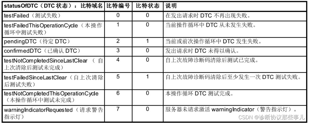 意思:该参数只有一个字节,其位定义与statusOfDTC相同,表示服务支持的状态位(一个服务器功能确定后,这个参数将是一个定值)。服务器不支持的位应设置为“0”,支持的位设置为“1”。