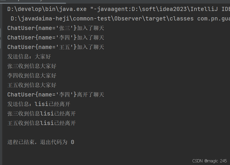 SimpleChatSystem 类:创建了一个 GroupChat 对象和多个 ChatUser 对象,并模拟了消息的发送过程。每次发送消息时,所有注册的用户都会收到通知。