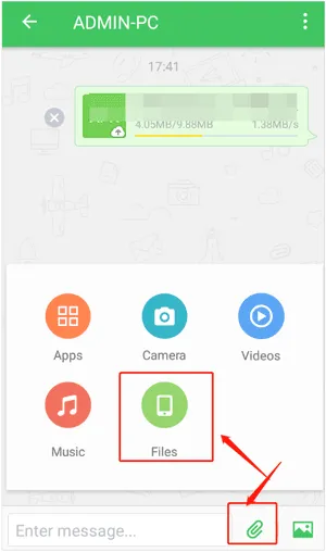 步骤3:点击“ Paperclip ”>“文件”,从Android设备中选择视频。然后将它们发送到电脑。片刻之后,您将在电脑上收到视频。