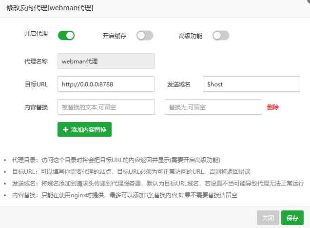 在你新建的网站下,点击设置,然后添加反向代理,目标URL填写你的webman地址和端口即可