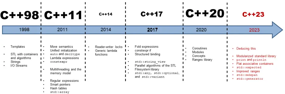 C++11 是 C++ 的第⼆个主要版本,并且是从 C++98 起的最重要更新。它引⼊了⼤量更改,标准化了既有实践,并改进了对 C++ 程序员可⽤的抽象。在它最终由 ISO 在 2011 年 8 ⽉ 12 ⽇采纳前,⼈们曾使⽤名称“C++0x”,因为它曾被期待在 2010 年之前发布。C++03 与 C++11 期间花了 8 年时间,故⽽这是迄今为⽌最⻓的版本间隔。从那时起,C++ 有规律地每 3 年更新⼀次。
