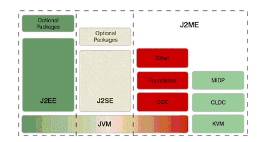 在消费电子和嵌入式设备领域,内存从几百K到几十M,从没有屏幕到Web-TV,CPU从低功耗的嵌入式处理器到206MHz的RISC处理器,硬件条件的差异是相当大的。这就使得J2ME的标准需要有不同的层次和类别来适应这个复杂的领域,因此相比之下J2ME就比J2SE和J2EE的标准要复杂得多。因此,清楚的理解J2ME的体系结构的划分才能更好的理解和掌握J2ME。