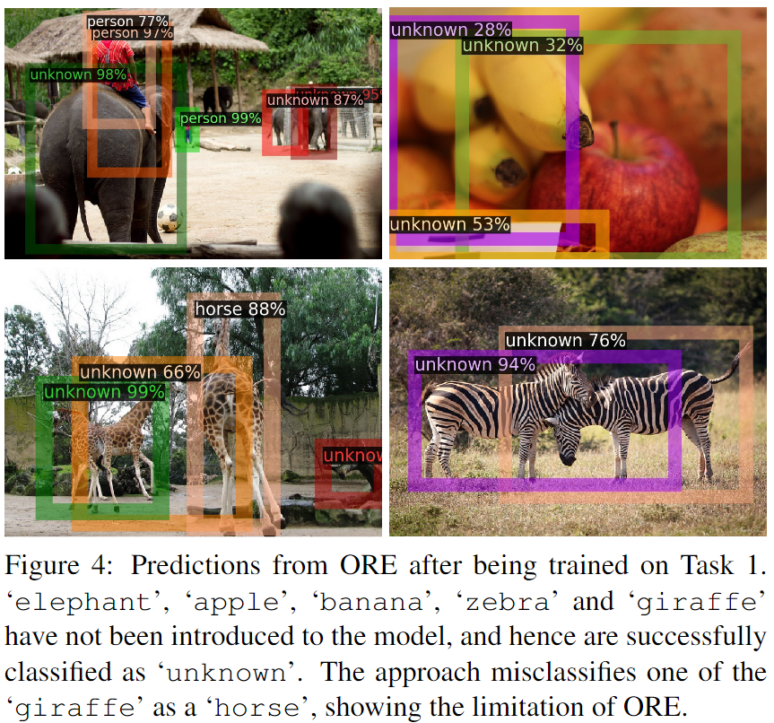 我们发现ORE对未知物体独特建模能力带来一个有趣的结果:在增量式物体检测(iOD)任务中,其性能显著优于现有最佳方法(表3)。这是因为ORE减少了未知物体被误分类为已知物体的情况,使检测器能逐步学习真实的前景物体。我们采用iOD领域标准协议56, 57来评估ORE,该方法通过已在其他类别上训练的检测器,逐步学习Pascal VOC 200711中的类别组(10类、5类和最后一类)。值得注意的是,此处使用的ORE完全保持第4节所述方法未做任何改动。通过消融对比聚类(CC)和基于能量的未知标识(EBUI)发现,移除这些组件会导致性能低于标准ORE。