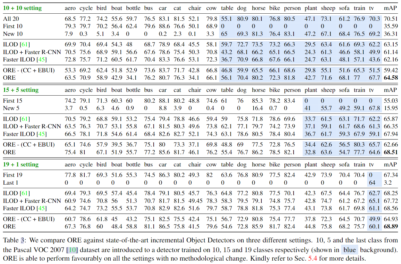 We find an interesting consequence of the ability of ORE to distinctly model unknown objects: it performs favorably well on the incremental object detection (iOD) task against the state-of-the-art (Tab. 3). This is because, ORE reduces the confusion of an unknown object being classified as a known object, which lets the detector incrementally learn the true foreground objects. We use the standard protocol 56, 57 used in the iOD domain to evaluate ORE, where group of classes (10, 5 and the last class) from Pascal VOC 2007 11 are incrementally learned by a detector trained on the remaining set of classes. Remarkably, ORE is used as it is, without any change to the methodology introduced in Sec. 4. We ablate contrastive clustering (CC) and energy based unknown identification (EBUI) to find that it results in reduced performance than standard ORE.