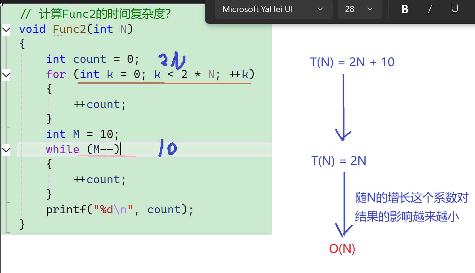 for循环执行2N次,while循环执行10次,这里最高阶是N^1,根据大O阶规则(2),系数2随着N的增长对结果影响会越来越小,因此时间复杂度的结果就是O(N)。