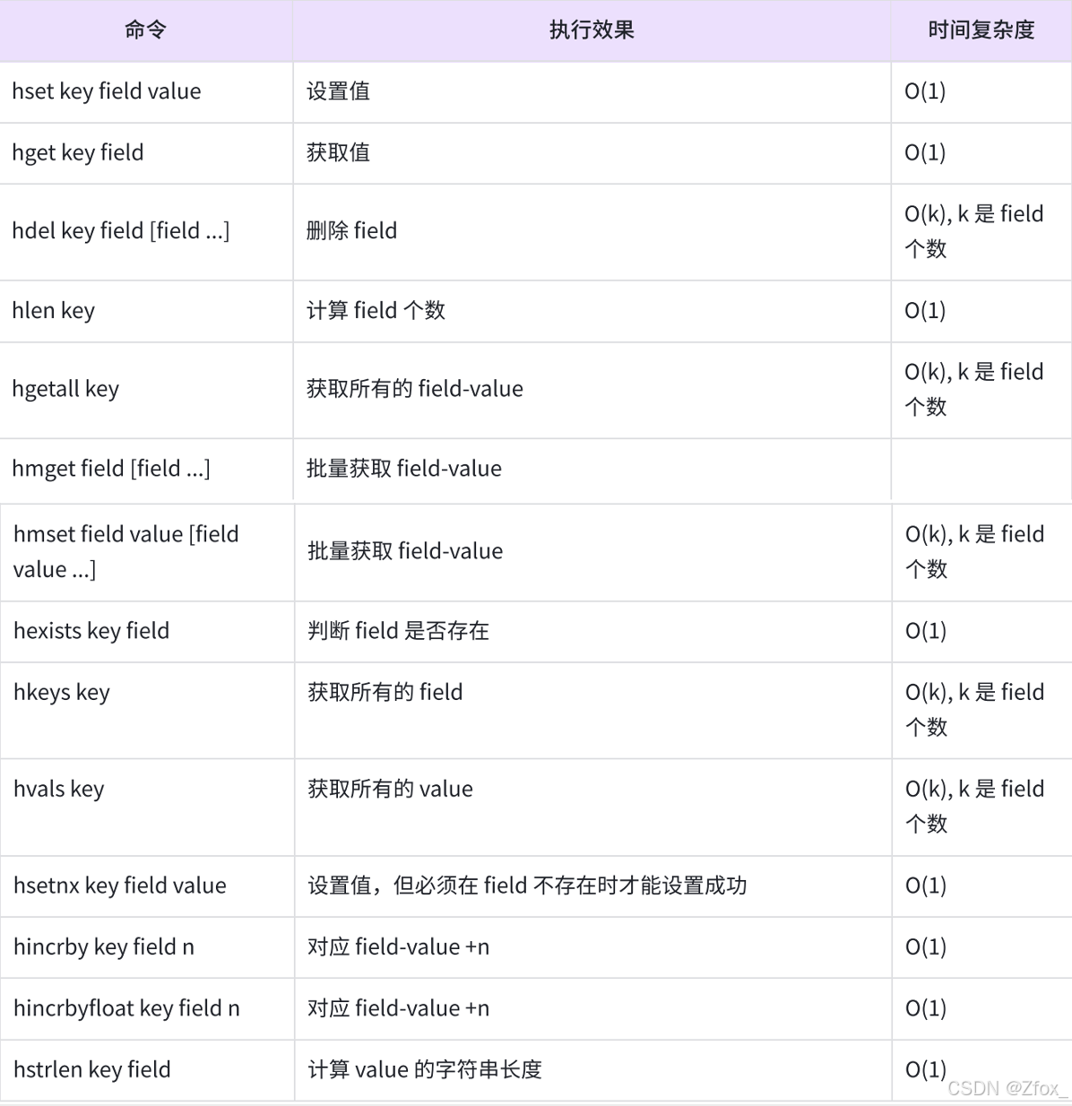 表2-4是哈希类型命令的效果、时间复杂度,开发⼈员可以参考此表,结合⾃⾝业务需求和数据⼤⼩选择合适的命令。