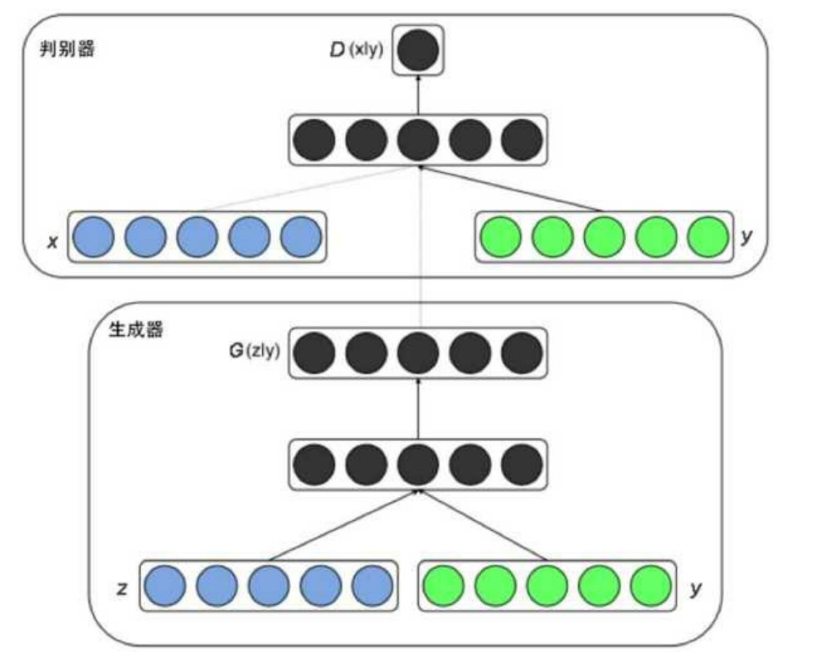 - 判别器:输入为样本 ( x ) 与条件 ( y ) 的级联向量 ([x, y]),输出为样本为真实样本的概率 ( D(x, y) )。
